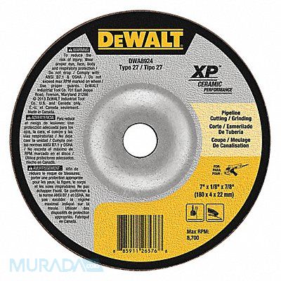 Depressed Center Wheels Abrasive Wheel Type Type 27 Abrasive Wheel Diameter 7 in Thickness 0.125 in Arbor Hole Size 7/8 in Abrasive Material Ceramic Abrasive Grit 24 Max RPM 8 700 RPM Series XP Ceramic Grade Coarse Application General Weld Hard Alloys Metal Pipelining Stainless Steel Structural Steel Thin-Heavy Wall Pipe