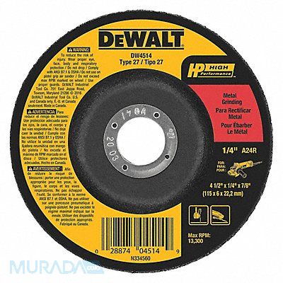Depressed Center Wheels Abrasive Wheel Type Type 27 Abrasive Wheel Diameter 4 1/2 in Thickness 0.25 in Arbor Hole Size 7/8 in Abrasive Material Aluminum Oxide Abrasive Grit 24 Max RPM 13 300 RPM Series High Performance Grade Very Coarse Application Ferrous Metal