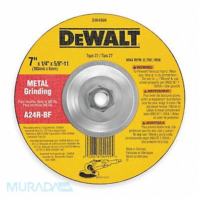 Depressed Center Wheels Abrasive Wheel Type Type 27 Abrasive Wheel Diameter 4 1/2 in Thickness 0.25 in Arbor Hole Size 5/8-11 in Abrasive Material Aluminum Oxide Abrasive Grit 24 Max RPM 13 300 RPM Series High Performance Grade Very Coarse Application Ferrous Metal