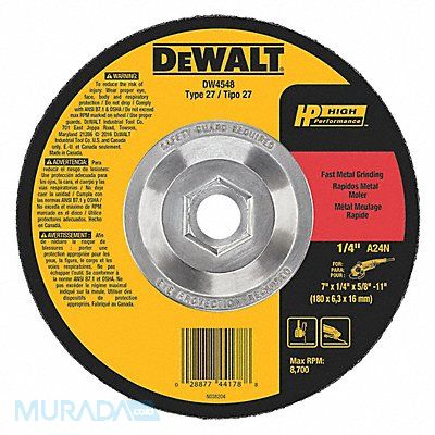 Depressed Center Wheels Abrasive Wheel Type Type 27 Abrasive Wheel Diameter 7 in Thickness 0.25 in Arbor Hole Size 5/8-11 in Abrasive Material Aluminum Oxide Abrasive Grit 24 Max RPM 8 700 RPM Series Metal AO Grade Very Coarse Application Ferrous Metal Stainless