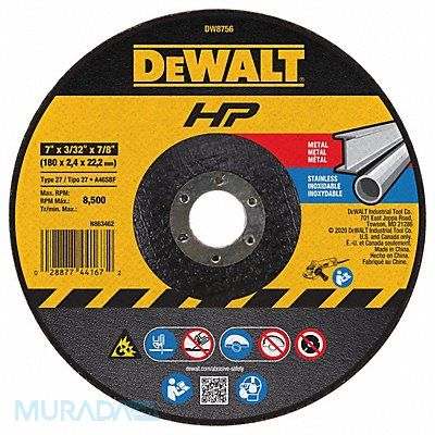 Depressed Center Wheels Abrasive Wheel Type Type 27 Abrasive Wheel Diameter 7 in Thickness 0.0938 in Arbor Hole Size 7/8 in Abrasive Material Aluminum Oxide Abrasive Grit 24 Max RPM 8 700 RPM Series High Performance Grade Very Coarse Application Ferrous Metal