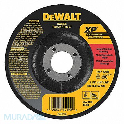 Depressed Center Wheels Abrasive Wheel Type Type 27 Abrasive Wheel Diameter 4 1/2 in Thickness 0.25 in Arbor Hole Size 7/8 in Abrasive Material Zirconia Alumina Abrasive Grit 24 Max RPM 13 300 RPM Series Extended Performance Grade Very Coarse Application Ferrous Metal Stainless