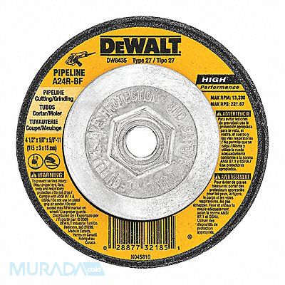 Depressed Center Wheels Abrasive Wheel Type Type 27 Abrasive Wheel Diameter 4 1/2 in Thickness 0.125 in Arbor Hole Size 5/8-11 in Abrasive Material Aluminum Oxide Abrasive Grit 24 Max RPM 13 300 RPM Series High Performance Grade Very Coarse Application Ferrous Metal Pipeline