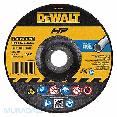 Depressed Center Wheels Abrasive Wheel Type Type 27 Abrasive Wheel Diameter 6 in Thickness 0.045 in Arbor Hole Size 7/8 in Abrasive Material Aluminum Oxide Abrasive Grit 60 Max RPM 10 100 RPM Series High Performance Grade Medium Application Contaminate Free Stainless