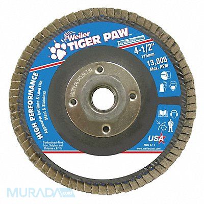 Flap Disc Abrasive Type Coated Abrasive Material Zirconia Alumina Grade Medium Backing Plate Material Phenolic Connector Size 5/8 In.-11 Connector Type Threaded Hole Density Rating Standard Flap Disc Type Type 29 Overall Diameter 4 1/2 in Series Tiger Paw Backing Material Phenolic Grit 60 Maximum Operating Speed 13 000 RPM Color Blue