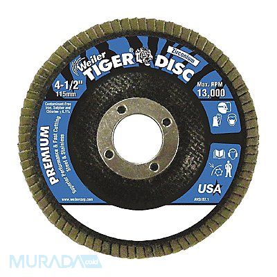 Flap Disc Abrasive Type Coated Abrasive Material Zirconia Alumina Grade Medium Backing Plate Material Aluminum Connector Size 5/8 in-11 Connector Type Threaded Hole Density Rating Standard Flap Disc Type Type 29 Overall Diameter 4 1/2 in Series Tiger Aluminum Back Backing Material Aluminum Grit 60 Maximum Operating Speed 13 000 RPM Color Blue