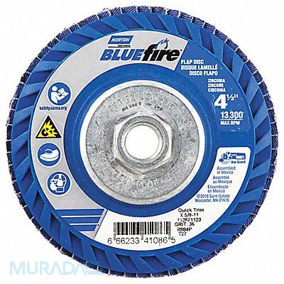 Flap Disc Abrasive Type Coated Abrasive Material Zirconia Alumina Grade Extra Coarse Backing Plate Material Plastic Connector Size 5/8 In.-11 Connector Type Threaded Hole Density Rating Standard Flap Disc Type Type 27 Overall Diameter 4 1/2 in Series BlueFire R884P Backing Material Cotton Backing Weight Y Coating Coverage Semi-Open Grit P36 Maximum Operating Speed 13 300 RPM Color Blue Features Trimmable Package Quantity 2