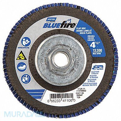 Flap Disc Abrasive Type Coated Abrasive Material Zirconia Alumina Grade Coarse Backing Plate Material Fiberglass Connector Size 5/8 In.-11 Connector Type Threaded Hole Density Rating Standard Flap Disc Type Type 29 Overall Diameter 4 1/2 in Series BlueFire R884P Backing Material Cotton Backing Weight Y Coating Coverage Semi-Open Grit P80 Maximum Operating Speed 13 300 RPM Color Blue Package Quantity 2