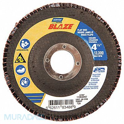 H7407 Flap Disc Abrasive Type Coated Abrasive Material Ceramic Grade Coarse Backing Plate Material Fiberglass Connector Size 7/8 in Connector Type Unthreaded Hole Density Rating Standard Flap Disc Type Type 29 Overall Diameter 4 1/2 in Series Blaze R980P Backing Material Polyester Backing Weight Y Grit 60 Maximum Operating Speed 13 300 RPM Color Orange Features Performance Coated Resistance Properties Fray