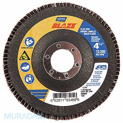 H7407 Flap Disc Abrasive Type Coated Abrasive Material Ceramic Grade Coarse Backing Plate Material Fiberglass Connector Size 7/8 in Connector Type Unthreaded Hole Density Rating Standard Flap Disc Type Type 29 Overall Diameter 4 1/2 in Series Blaze R980P Backing Material Polyester Backing Weight Y Grit 80 Maximum Operating Speed 13 300 RPM Color Orange Features Performance Coated Resistance Properties Fray