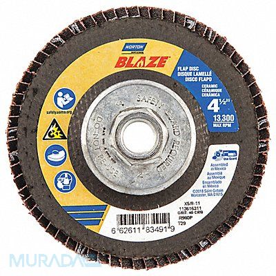 H7406 Flap Disc Abrasive Type Coated Abrasive Material Ceramic Grade Extra Coarse Backing Plate Material Fiberglass Connector Size 5/8 In.-11 Connector Type Threaded Hole Density Rating Standard Flap Disc Type Type 29 Overall Diameter 4 1/2 in Series Blaze R980P Backing Material Polyester Backing Weight Y Grit 40 Maximum Operating Speed 13 300 RPM Color Orange Features Performance Coated Resistance Properties Fray
