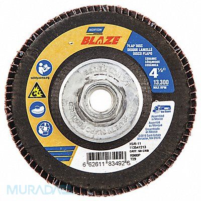H7406 Flap Disc Abrasive Type Coated Abrasive Material Ceramic Grade Coarse Backing Plate Material Fiberglass Connector Size 5/8 In.-11 Connector Type Threaded Hole Density Rating Standard Flap Disc Type Type 29 Overall Diameter 4 1/2 in Series Blaze R980P Backing Material Polyester Backing Weight Y Grit 60 Maximum Operating Speed 13 300 RPM Color Orange Features Performance Coated Resistance Properties Fray