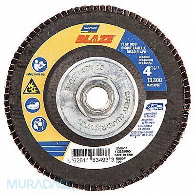 H7406 Flap Disc Abrasive Type Coated Abrasive Material Ceramic Grade Coarse Backing Plate Material Fiberglass Connector Size 5/8 In.-11 Connector Type Threaded Hole Density Rating Standard Flap Disc Type Type 29 Overall Diameter 4 1/2 in Series Blaze R980P Backing Material Polyester Backing Weight Y Grit 80 Maximum Operating Speed 13 300 RPM Color Orange Features Performance Coated Resistance Properties Fray