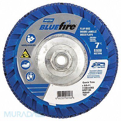 H5976 Flap Disc Abrasive Type Coated Abrasive Material Zirconia Alumina Grade Coarse Backing Plate Material Plastic Connector Size 5/8 In.-11 Connector Type Threaded Hole Density Rating Standard Flap Disc Type Type 27 Overall Diameter 7 in Series BlueFire R884P Backing Material Cotton Backing Weight Y Coating Coverage Semi-Open Grit P80 Maximum Operating Speed 8 600 RPM Color Blue Features Trimmable