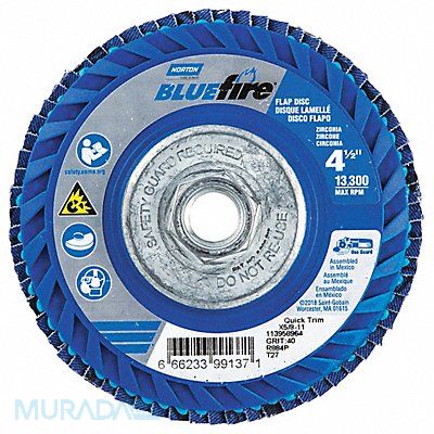 H5951 Flap Disc Abrasive Type Coated Abrasive Material Zirconia Alumina Grade Extra Coarse Backing Plate Material Plastic Connector Size 5/8 In.-11 Connector Type Threaded Hole Density Rating Standard Flap Disc Type Type 27 Overall Diameter 4 1/2 in Series BlueFire R884P Backing Material Cotton Backing Weight Y Coating Coverage Semi-Open Grit P40 Maximum Operating Speed 13 300 RPM Color Blue Features Trimmable
