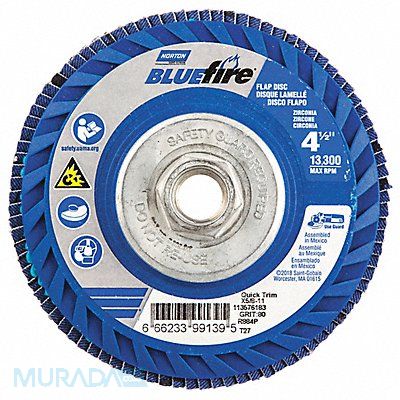 H5951 Flap Disc Abrasive Type Coated Abrasive Material Zirconia Alumina Grade Coarse Backing Plate Material Plastic Connector Size 5/8 In.-11 Connector Type Threaded Hole Density Rating Standard Flap Disc Type Type 27 Overall Diameter 4 1/2 in Series BlueFire R884P Backing Material Cotton Backing Weight Y Coating Coverage Semi-Open Grit P80 Maximum Operating Speed 13 300 RPM Color Blue Features Trimmable