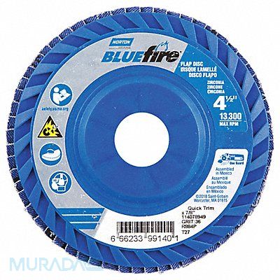 H5956 Flap Disc Abrasive Type Coated Abrasive Material Zirconia Alumina Grade Extra Coarse Backing Plate Material Plastic Connector Size 7/8 in Connector Type Unthreaded Hole Density Rating Standard Flap Disc Type Type 27 Overall Diameter 4 1/2 in Series BlueFire R884P Backing Material Cotton Backing Weight Y Coating Coverage Semi-Open Grit P36 Maximum Operating Speed 13 300 RPM Color Blue Features Trimmable