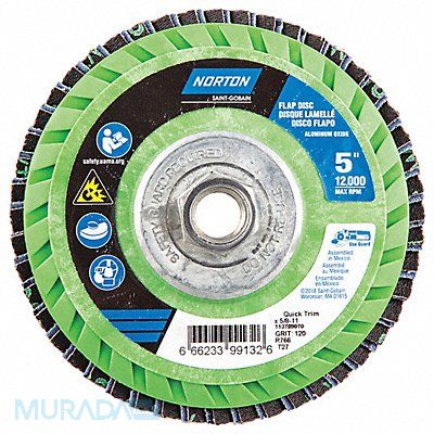 H5959 Flap Disc Abrasive Type Coated Abrasive Material Zirconia Alumina Grade Medium Backing Plate Material Plastic Connector Size 5/8 In.-11 Connector Type Threaded Hole Density Rating Standard Flap Disc Type Type 27 Overall Diameter 5 in Series Gemini R766 Backing Material Cotton Backing Weight X Grit P120 Maximum Operating Speed 12 000 RPM Color Black Features Trimmable