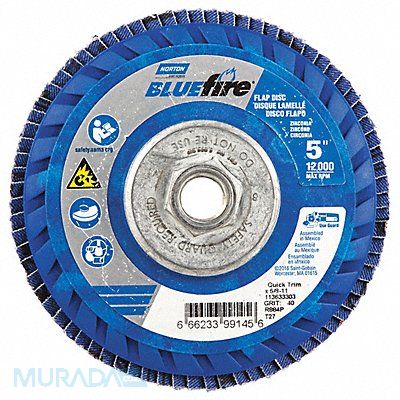 H5961 Flap Disc Abrasive Type Coated Abrasive Material Zirconia Alumina Grade Extra Coarse Backing Plate Material Plastic Connector Size 5/8 In.-11 Connector Type Threaded Hole Density Rating Standard Flap Disc Type Type 27 Overall Diameter 5 in Series BlueFire R884P Backing Material Cotton Backing Weight Y Coating Coverage Semi-Open Grit P40 Maximum Operating Speed 12 000 RPM Color Blue Features Trimmable