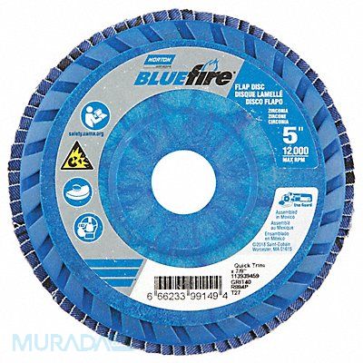 H5965 Flap Disc Abrasive Type Coated Abrasive Material Zirconia Alumina Grade Extra Coarse Backing Plate Material Plastic Connector Size 7/8 in Connector Type Unthreaded Hole Density Rating Standard Flap Disc Type Type 27 Overall Diameter 5 in Series BlueFire R884P Backing Material Cotton Backing Weight Y Coating Coverage Semi-Open Grit P40 Maximum Operating Speed 12 000 RPM Color Blue Features Trimmable