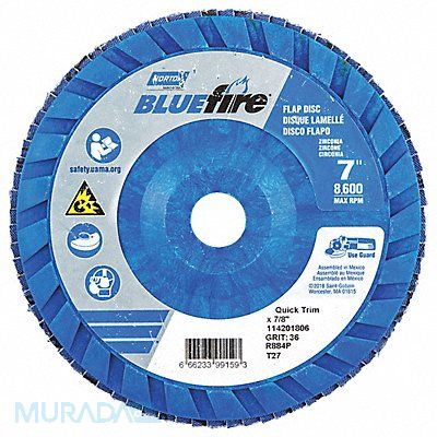 H5981 Flap Disc Abrasive Type Coated Abrasive Material Zirconia Alumina Grade Extra Coarse Backing Plate Material Plastic Connector Size 7/8 in Connector Type Unthreaded Hole Density Rating Standard Flap Disc Type Type 27 Overall Diameter 7 in Series BlueFire R884P Backing Material Cotton Backing Weight Y Coating Coverage Semi-Open Grit P36 Maximum Operating Speed 8 600 RPM Color Blue Features Trimmable