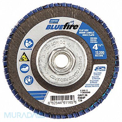 H7426 Flap Disc Abrasive Type Coated Abrasive Material Zirconia Alumina Grade Extra Coarse Backing Plate Material Fiberglass Connector Size 5/8 In.-11 Connector Type Threaded Hole Density Rating Standard Flap Disc Type Type 29 Overall Diameter 4 1/2 in Series BlueFire R884P Backing Material Cotton Backing Weight Y Coating Coverage Semi-Open Grit P36 Maximum Operating Speed 13 300 RPM Color Blue