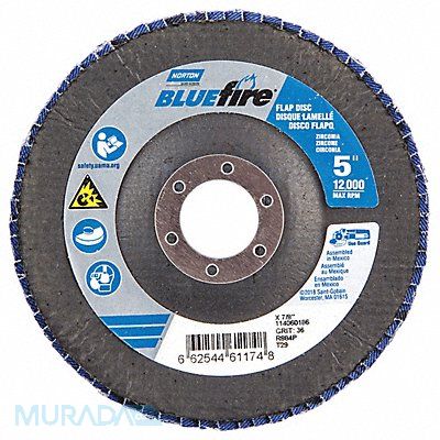 H7381 Flap Disc Abrasive Type Coated Abrasive Material Zirconia Alumina Grade Extra Coarse Backing Plate Material Fiberglass Connector Size 7/8 in Connector Type Unthreaded Hole Density Rating Standard Flap Disc Type Type 29 Overall Diameter 5 in Series BlueFire R884P Backing Material Cotton Backing Weight Y Coating Coverage Semi-Open Grit P36 Maximum Operating Speed 12 000 RPM Color Blue