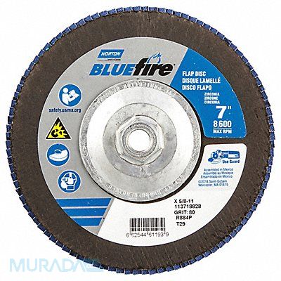 H7386 Flap Disc Abrasive Type Coated Abrasive Material Zirconia Alumina Grade Coarse Backing Plate Material Fiberglass Connector Size 5/8 In.-11 Connector Type Threaded Hole Density Rating Standard Flap Disc Type Type 29 Overall Diameter 7 in Series BlueFire R884P Backing Material Cotton Backing Weight Y Coating Coverage Semi-Open Grit P80 Maximum Operating Speed 8 600 RPM Color Blue