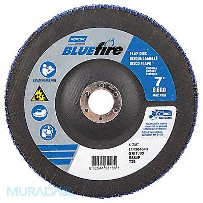 H7388 Flap Disc Abrasive Type Coated Abrasive Material Zirconia Alumina Grade Coarse Backing Plate Material Fiberglass Connector Size 7/8 in Connector Type Unthreaded Hole Density Rating Standard Flap Disc Type Type 29 Overall Diameter 7 in Series BlueFire R884P Backing Material Cotton Backing Weight Y Coating Coverage Semi-Open Grit P80 Maximum Operating Speed 8 600 RPM Color Blue