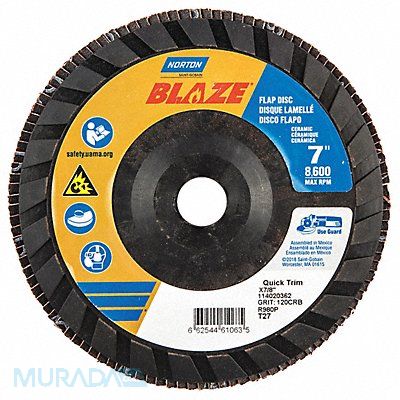H5983 Flap Disc Abrasive Type Coated Abrasive Material Ceramic Grade Medium Backing Plate Material Plastic Connector Size 7/8 in Connector Type Unthreaded Hole Density Rating Standard Flap Disc Type Type 27 Overall Diameter 7 in Series Blaze R980P Backing Material Polyester Backing Weight Y Grit 120 Maximum Operating Speed 8 600 RPM Color Orange Features Performance Coated Trimmable Resistance Properties Fray