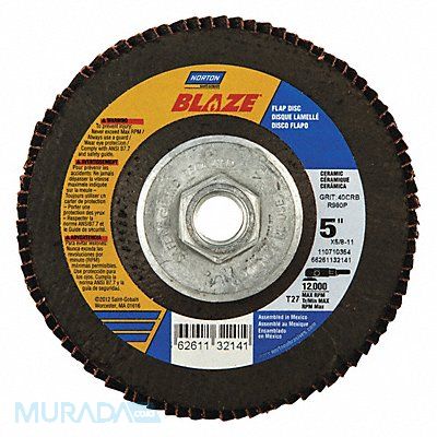 J5404 Flap Disc Abrasive Type Coated Abrasive Material Ceramic Grade Extra Coarse Backing Plate Material Fiberglass Connector Size 5/8 In.-11 Connector Type Threaded Hole Density Rating High Flap Disc Type Type 27 Overall Diameter 5 in Series Blaze R980P Backing Material Polyester Backing Weight Y Grit 40 Maximum Operating Speed 12 000 RPM Color Orange Features Performance Coated Resistance Properties Fray