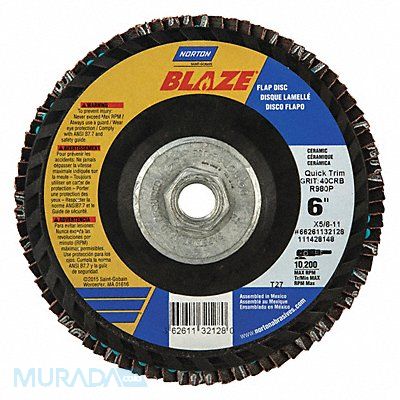 J5402 Flap Disc Abrasive Type Coated Abrasive Material Ceramic Grade Extra Coarse Backing Plate Material Plastic Connector Size 5/8 In.-11 Connector Type Threaded Hole Density Rating Standard Flap Disc Type Type 27 Overall Diameter 6 in Series Blaze R980P Backing Material Polyester Backing Weight Y Grit 40 Maximum Operating Speed 10 200 RPM Color Orange Features Performance Coated Trimmable Resistance Properties Fray