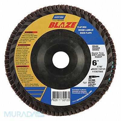 J5403 Flap Disc Abrasive Type Coated Abrasive Material Ceramic Grade Extra Coarse Backing Plate Material Plastic Connector Size 7/8 in Connector Type Unthreaded Hole Density Rating Standard Flap Disc Type Type 27 Overall Diameter 6 in Series Blaze R980P Backing Material Polyester Backing Weight Y Grit 40 Maximum Operating Speed 10 200 RPM Color Orange Features Performance Coated Trimmable Resistance Properties Fray