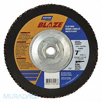 J5408 Flap Disc Abrasive Type Coated Abrasive Material Ceramic Grade Extra Coarse Backing Plate Material Fiberglass Connector Size 5/8 In.-11 Connector Type Threaded Hole Density Rating High Flap Disc Type Type 27 Overall Diameter 7 in Series Blaze R980P Backing Material Polyester Backing Weight Y Grit 40 Maximum Operating Speed 8 600 RPM Color Orange Features Performance Coated Resistance Properties Fray