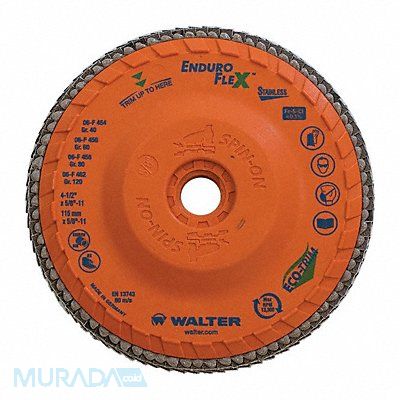 Flap Disc Abrasive Type Coated Abrasive Material Aluminum Oxide Grade 120 Backing Plate Material Eco-Trim Connector Size 5/8 In.-11 Connector Type Threaded Hole Density Rating Standard Flap Disc Type Type 27 Overall Diameter 4 1/2 in Quick Change System TS Series ENDURO-FLEX Stainless Backing Material Eco-Trim Backing Weight Not Applicable Coating Coverage Not Applicable Grit 120 Maximum Operating Speed 13 300 RPM Features Trimmable