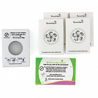 Feminine Hygiene Starter Kit Receptacle Container Style Utility Container Mounting Style Wall-Mounted Height 5 in Width 3 1/2 in Material Plastic Shape Rectangular Color White Lid Type No Lid For Use With SBX50 Includes (1) 421X19 Sanitary Napkin Disposal Bag Dispenser (4) 421X18 Sanitary Napkin Disposal Bag Packs and (1) Sign Standards ISSA
