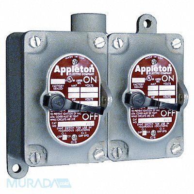 Tumbler Switch Front Operated Series EDS Number of Gangs 2 Switch Type 1-Pole Amps 20 A Voltage 120 to 277V AC HP 1 hp @ 120V AC 2 hp @ 240V AC Hub Style Dead-End Hub Size 1 in Mounting Mounting Holes Legend Markings On/Off Special Features Corrosion Resistant Pad Lockable in the On or Off Position NEMA Rating 7C 7D 9E 9F 9G Standards UL 1203 UL 894