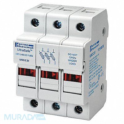 Finger-Safe Fuse Block Body Material Polyamide Compatible Fuse Series ATDR ATMR ATQR CCMR FNQ-R KLDR KLKR KTK-R LP-CC Pressure Plate Amp Range 0 to 30 A Fits Fuse Type Class CC For Fuse Size 1-1/2 in L x 13/32 in dia Fuse Block Design Finger-Safe Rejection Height 2.32 in Length 3.07 in Mounting Style DIN Rail Number of Poles 3 Standards CSA Certified UL Listed Visual Indication Indicating Voltage Rating 600V AC/DC Width 2.07 in Wire Range 14 to 6 AWG