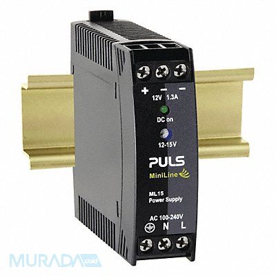 DC Power Supply Input Voltage 100 to 240 V AC Output Voltage 12 to 15V DC Power Rating 15W Output Amps 1.3 Mounting DIN Rail Switching Case Material Plastic Case Height 75 mm Width 22.5 mm Depth 91 mm Series MiniLine Hz 50 to 60 Hz Phase - Electrical Single IP Rating 20 Output Noise 75mV Hold Up Time 46 msec Status Indicator LED Features High Efficiency and Long Lifetime Operating Temp Range -10 Degrees to 70 Degrees C