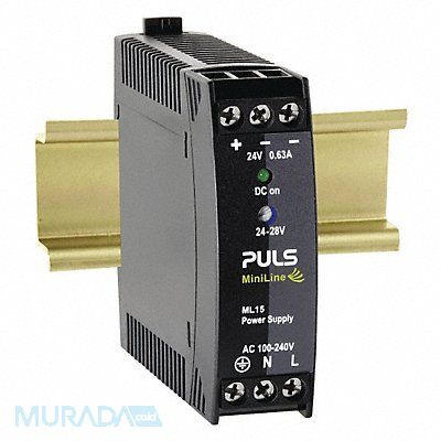 DC Power Supply Input Voltage 100 to 240 V AC Output Voltage 24 to 28V DC Power Rating 15W Output Amps 0.63 Mounting DIN Rail Switching Case Material Plastic Case Height 75 mm Width 22.5 mm Depth 91 mm Series MiniLine Hz 50 to 60 Hz Phase - Electrical Single IP Rating 20 Output Noise 50mV Hold Up Time 47 msec Status Indicator LED Features High Efficiency and Long Lifetime Operating Temp Range -10 Degrees to 70 Degrees C