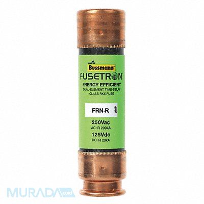 Fuse 15/100 A 250V AC 125V DC Class RK5 FRN-R Series Nonindicating Time Delay Body Style Cylindrical Fits Fuse Block Style Rejection Interrupt Rating 200kA at 250V AC 20kA at 125V DC Fuse Size 2 in L x 9/16 in dia Length 2 in Diameter 9/16 in Equivalent Brand and Series Bussmann FRN-R Edison ECNR Littelfuse FLNR Mersen TR-R Equivalent Series ECNR FLNR FRN-R TR-R Compatible Fuse Block Series HM600 R250 Body Material Fiberglass Dual Element