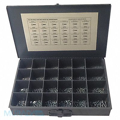 Screw Assortment Finish Zinc Plated Head Type Pan Drive Phillips Number of Sizes 24 Number of Pieces 600 Material Steel Pack Size Small System of Measurement Metric Container Material Metal Head Style Pan Includes Screws (25) Each M3-0.5x4 6 8 10 12 16 M4-0.7x6 8 10 12 16 20 M5-0.8x8 10 12 16 20 25 M6-1.0x10 12 16 20 25 30 Metal Compartment Box with Lid Includes Flat Washers No Includes Hex Head Screws No Includes Hex Nuts No Includes Lock Washers No