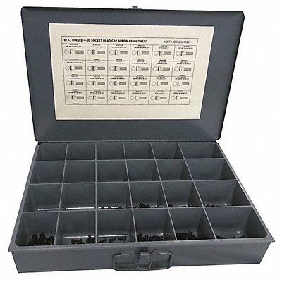 Socket Cap Screw Assortment Socket Head Cap Screw Head Type Standard Number of Pieces 600 System of Measurement Inch Thread Size 1 in 1/2 in 1/4 in-20 #10-24 #10-32 3/4 in 3/8 in 5/8 in #8-32 Screw Size #6 to 1/4 in Number of Sizes 24 Drive Type Socket Material Alloy Steel Finish Plain Pack Size Small Pack Special Features Not Applicable Container Material Metal Includes Compartment Box with Lid Number of Different Sizes 24 Number of Screws 600