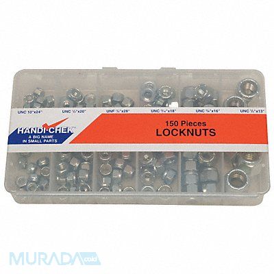 Hex Locknut Assortment Hex Type Standard Hex Includes Washers No Largest Thread Size 1/2 in-13 Lock Type Nylon Insert Number of Nuts 150 Number of Thread Sizes 6 Number of Washers 0 Nut Finish Zinc Plated Nut Material Steel Nut Type Hex Lock Nut Smallest Thread Size 1/4 in-20 System of Measurement Inch Thread Sizes #10-24 1/2 in-13 1/4 in-20 1/4 in-28 3/8 in-16 x 9/16 in 5/16 in-18