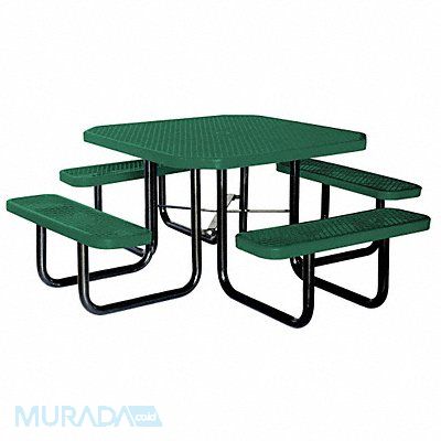 E5616 Picnic Table Octagon Entry Walk Through Tabletop Material Expanded Metal Overall Width 80 in Overall Depth 80 in Overall Height 29 1/4 in Bench Height 16 1/2 in Color Green Frame Finish Black Powder Coating Frame Material Steel Umbrella Hole 1 3/4 in Required Includes 1 Cross Brace 1 Table Top 4 Seats 8 Legs
