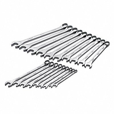 Combination Wrench Set Alloy Steel Chrome Number of Tools 19 Range of Head Sizes 6 mm to 24 mm Head Offset Angle 15 Degrees Offset Tool Roll Metric 6 mm 7 mm 8 mm 9 mm 10 mm 11 mm 12 mm 13 mm 14 mm 15 mm 16 mm 17 mm 18 mm 19 mm 20 mm 21 mm 22 mm 23 mm 24 mm Rounded Opening Angle (Deg.) 15 Degrees