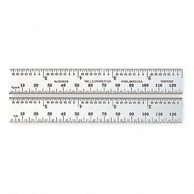 Steel Rule Spring Tempered Construction Hardened And Tempered Tool Steel Graduation Type 36 Graduations 1/2mm 1mm 32nds 64ths Length (In.) 12 in Length (mm) 300 mm Width (In.) 1 in Width (mm) 25.4 mm Satin Chrome Finish Markings C636-300 Hook Type - Includes -