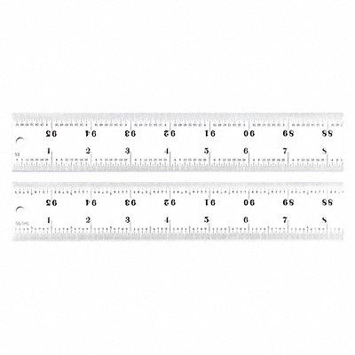 Ruler Construction Heavy Spring-Tempered Steel Graduation Type 16R Graduations 100ths 64ths Aircraft Quick-Reading 50ths Quick-Reading 32nds Length (In.) 96 in Width (In.) 1 1/2 in Satin Chrome Finish Markings Photo Engraved Black Painted