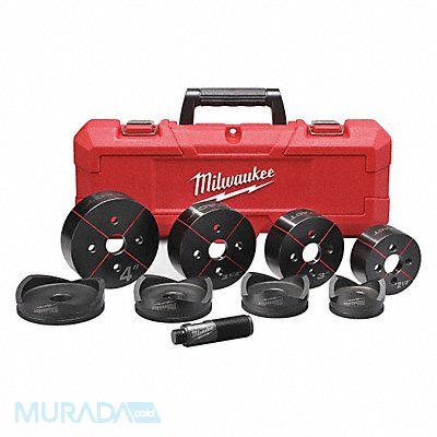 Knockout Punch Set For Use With Tool Type Hydraulic Maximum Sheet Metal Capacity-Steel 10 ga Includes Ratchet No Material Application Mild Steel Stainless Steel Slug Type Splitter Number of Punch/Dies Sets 9 Knockout Sizes Included 2 1/2 in 3 in 3 1/2 in 4 in Nominal Hole Size 4 in Punch Shape Circle Includes 1 1/8 in Draw Stud Carrying Case EXACT(TM) 2 1/2 in to 4 in Conduit Punches and Dies