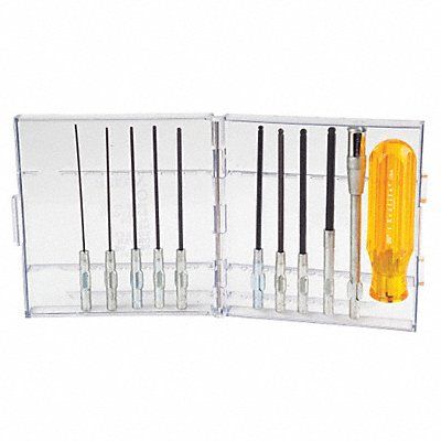 Precision Screwdriver Set 1/16 in 1/8 in 3/16 in 3/32 in 5/32 in 5/64 in 7/64 in 9/64 in Number of Pieces 11 ESD Safe No Includes Ball Hex 0.050 in x 4 in 1/16 in x 4 in 5/64 in x 4 in 3/32 in x 4 in 7/64 in x 4 in 1/8 in x 4 in 9/64 in x 4 in 5/32 in x 4 in 3/16 in x 4 in Hanlde Extension Plastic Case